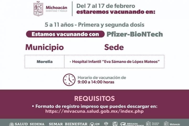 NOTICIAS 06/02/2023En febrero, vacunación contra COVID-19 para menores de 5 a 11 años: SSMTodas las niñas y niños de cinco a 11 años cumplidos que aún no se hayan vacunado contra el COVID-19, podrán ser inmunizados del 6 al 10 de febrero, anunció la Secretaría de Salud en Michoacán (SSM).