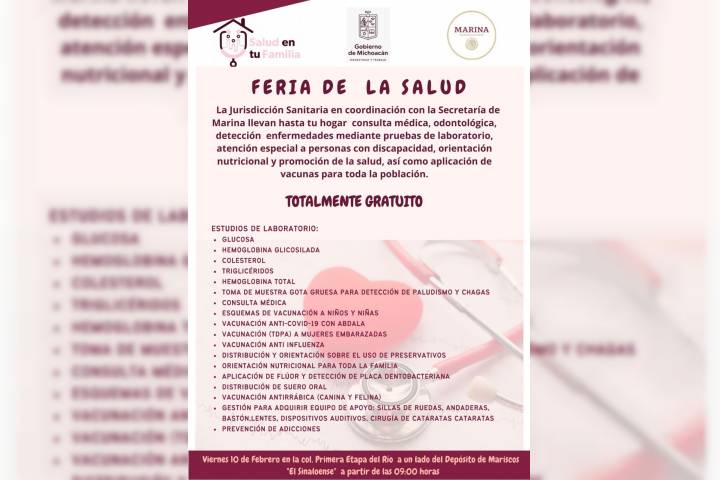 NOTICIAS 06/02/2023Acercará SSM servicios médicos gratuitos a Lázaro Cárdenas con Feria de la SaludCon el propósito de llevar a la población servicios médicos gratuitos y oportunos, la Secretaría de Salud de Michoacán (SSM), a través del programa Salud en tu Familia, llevará a cabo el próximo 10 de febrero la Feria de la Salud en el municipio de Lázaro Cárdenas.