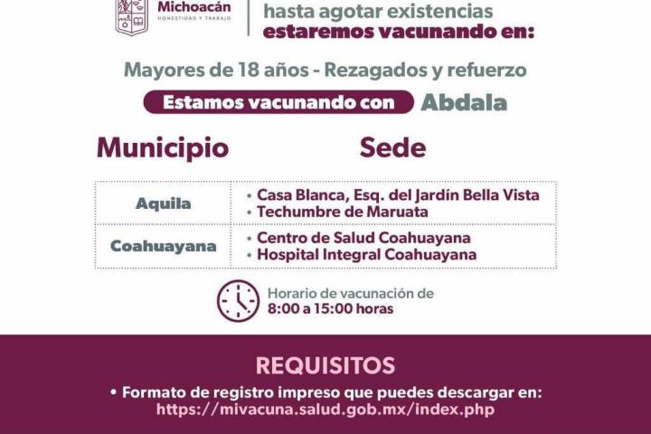 Es por ello que la Secretaría de Salud de Michoacán (SSM) exhorta a la población rezagada a inmunizarse con la vacuna Abdala, que consta de tres dosis que deben aplicarse con un espacio de 14 a 28 días, en las personas de primera vez.
