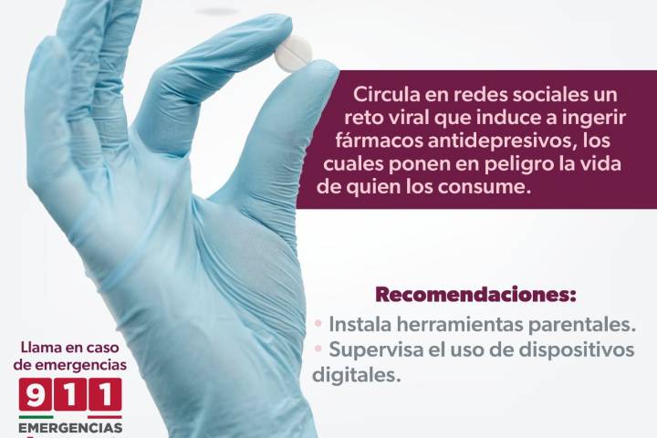 NOTICIAS 20/01/2023Alerta SSM riesgo por consumir fármacos y antidepresivos sin prescripción médicaLuego de que en redes sociales se hiciera popular un peligroso juego, en el que invitan a que los adolescentes y niños a ingerir fármacos antidepresivos, para poner a prueba el tiempo en que el medicamento hace reacción, la SecretarÃa de Salud de Michoacán (SSM) alerta a la población a vigilar a sus hijos y evitar asà una intoxicación, problemas respiratorios, sedación, inducción al coma e incluso la muerte.