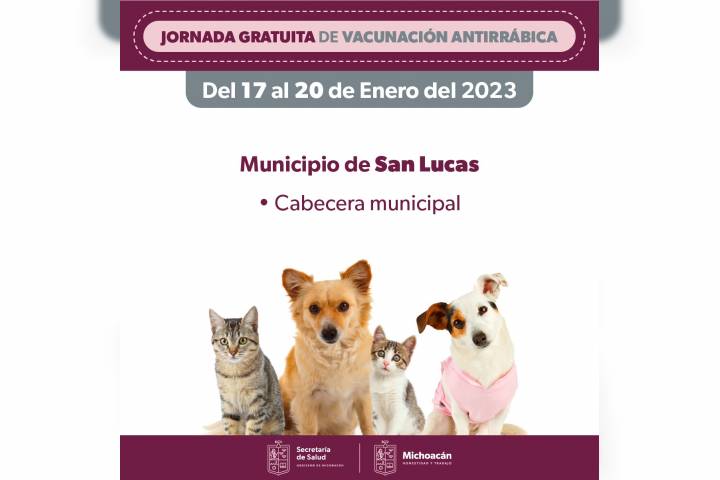 NOTICIAS 13/01/2023Arranca SSM campaña de vacunación antirrábica con énfasis en gatosPara mantener a la entidad libre de casos de rabia transmitida a humanos, la SecretarÃa de Salud de Michoacán (SSM) arrancará el próximo 16 de enero con su campaña de vacunación antirrábica dirigida a gatos, con la meta de inmunizar a 160 mil 400 felinos.