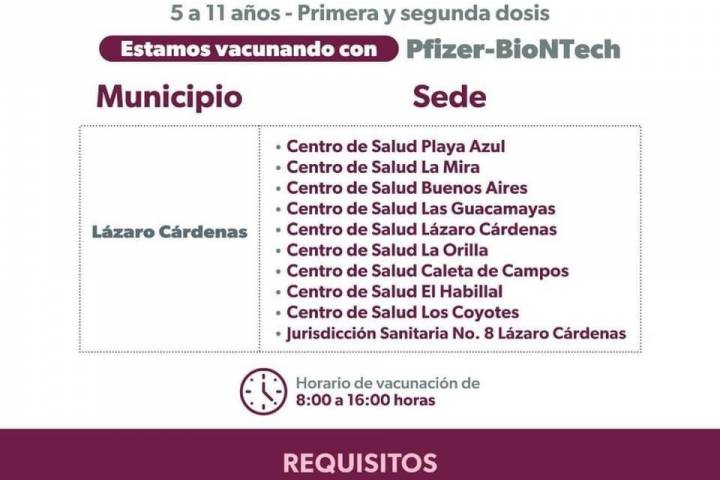 NOTICIAS 09/01/2023Continúa en Michoacán vacunación contra el COVID-19 Para dar seguimiento a la estrategia de contención contra el COVID-19, continúa en Michoacán la vacunación para rezagados de 5 a 11 años de edad que aún no completen sus esquemas, así como a los mayores de 18 años, tanto en la capital como en el interior del estado.