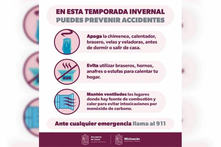 NOTICIAS 10/01/2023Reitera SSM llamado a evitar uso de anafres, fogones y braseros al interior del hogar Ante las bajas temperaturas registradas en la entidad, la Secretaría de Salud de Michoacán (SSM) reitera el llamado a la población a evitar encender anafres, braseros y fogones en el interior del hogar.