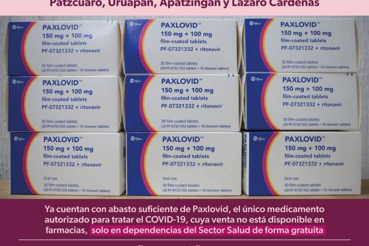 NOTICIAS 12/01/2023Abastece SSM a centros de salud con PaxlovidLos centros de salud de Morelia, Zamora, Zitácuaro, La Piedad, Pátzcuaro, Uruapan, Apatzingán y Lázaro Cárdenas, ya cuentan con abasto suficiente de Paxlovid, el único medicamento autorizado para tratar el COVID-19, cuya venta no está disponible en farmacias, solo en dependencias del Sector Salud y es gratuito.