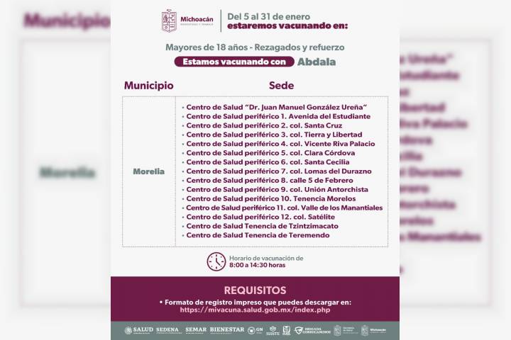NOTICIAS 05/01/2023Se amplía vacunación contra el COVID-19 en 15 centros de salud en MoreliaDel 5 al 31 de enero, la Secretaría de Salud de Michoacán (SSM) ampliará la vacunación contra el COVID-19 en 15 centros de salud de Morelia.