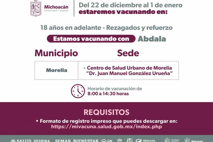 NOTICIAS 22/12/2022Continúa la vacunación contra el Covid-19 en MoreliaLa SecretarÃa de Salud de Michoacán (SSM) continúa con la vacunación contra el Covid-19 para todos los rezagados mayores de 18 años; en el caso de Morelia el biológico puede solicitarse en el Centro de Salud "Dr. Manuel González Urueña", ubicado junto a la Plaza del Carmen, de lunes a domingo.