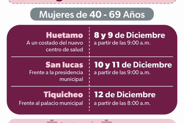 En Huetamo, la jornada será los días 8 y 9 de diciembre en horario de 09:00 a 18:00 horas, en una unidad móvil que se instalará a un costado del nuevo centro de salud.