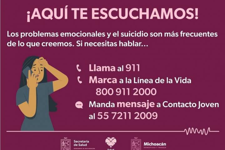 NOTICIAS 08/12/2022Línea de la Vida, ayuda profesional para personas con depresión La atención temprana de la depresión puede prevenir intentos de suicidio o su consumación, es por ello que la Secretaría de Salud de Michoacán (SSM), a través de la Dirección de Salud Mental, invita a la población a solicitar ayuda profesional a la Línea de la Vida, al teléfono gratuito 800 911 2000.