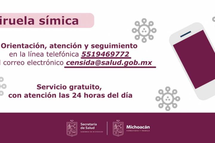 NOTICIAS 09/12/2022Continúa disponible línea telefónica para orientación de la viruela símicaLa Secretaría de Salud de Michoacán (SSM) recuerda a la población, que sigue abierta y en operación la línea telefónica 5519469772 para recibir orientación sobre detección y atención oportuna de la viruela símica.