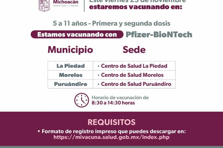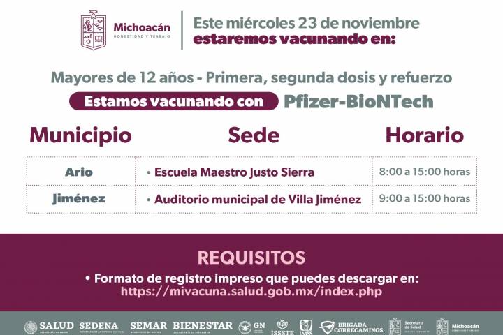 Asimismo, se les aplicarán primeras y segundas dosis, para lo cual el día 23 de noviembre se instalarán dos sedes para la inmunización en la Escuela Maestro Justo Sierra de Ario y el Auditorio Municipal de Villa Jiménez