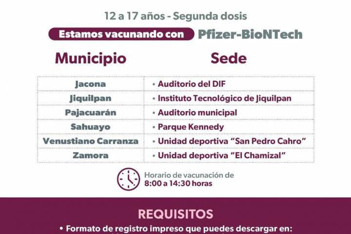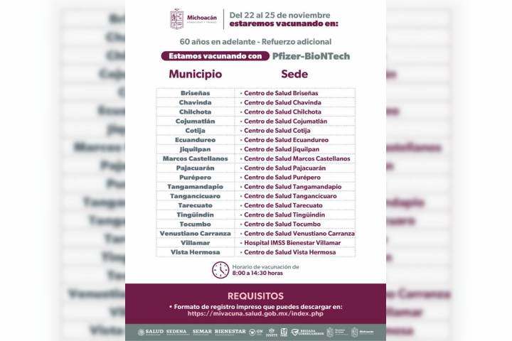 Las sedes ya están anunciadas en la página de la Secretaría de Salud de Michoacán (SSM) y el formato de registro puede hacerse a través del enlace https://mivacuna.salud.gob.mx.