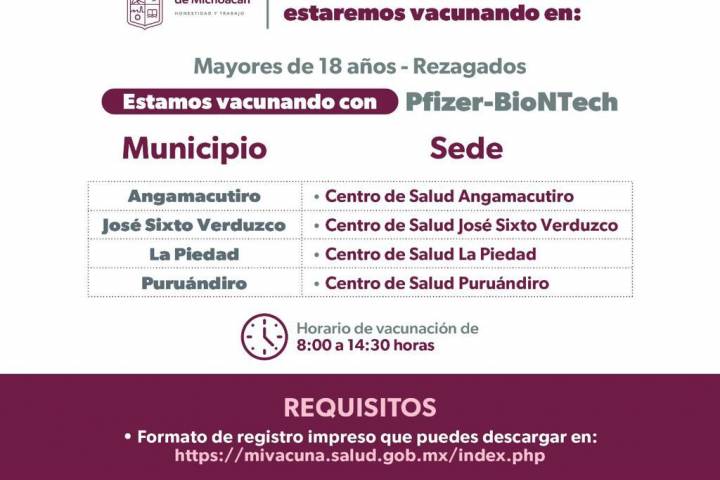 NOTICIAS 14/11/2022Rezagados mayores de 18 años recibirán primeras y segundas dosis de Pfizer BioNTech durante noviembreTodos los michoacanos, mayores de 18 años que aún no se han vacunado contra el COVID-19 podrán hacerlo con Pfizer BioNTech.