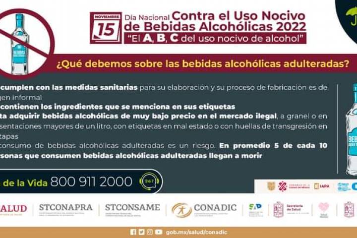 De acuerdo con información de la Comisión Nacional contra las Adicciones (Conadic), el alcohol adulterado es elaborado con ingredientes de origen desconocido y en sitios informales que no cumplen con la Norma Oficial Mexicana NOM-142-SSA1/SCFI-... Ver más...