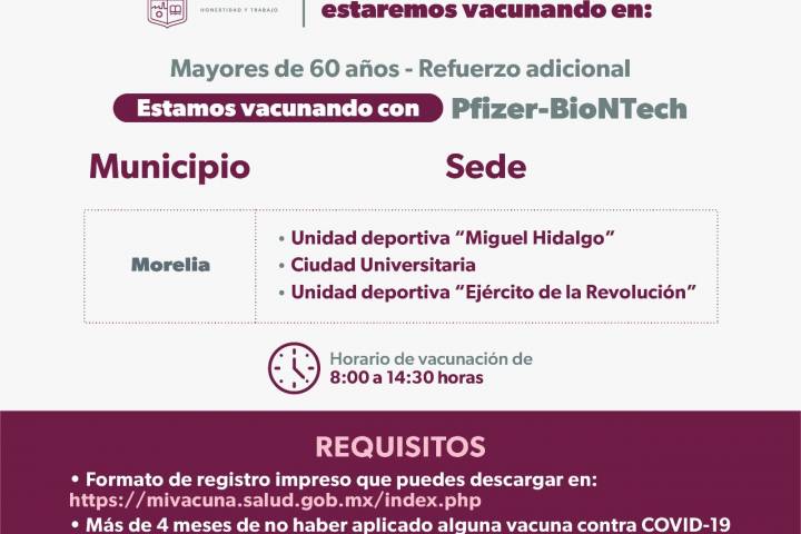 Con ello se avanza con el Plan Nacional de Salud, por lo que del 14 al 17 de noviembre continuará la aplicación del refuerzo adicional en Morelia en tres sedes que son: la unidad deportiva "Miguel Hidalgo", Ciudad Universitaria y unidad deportiva "Ejér... Ver más...