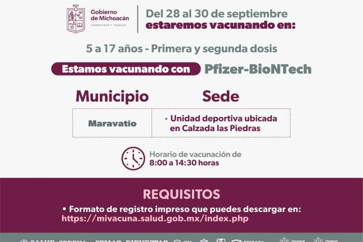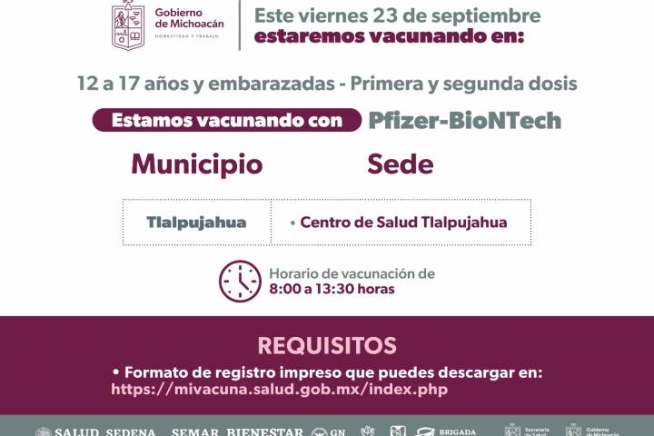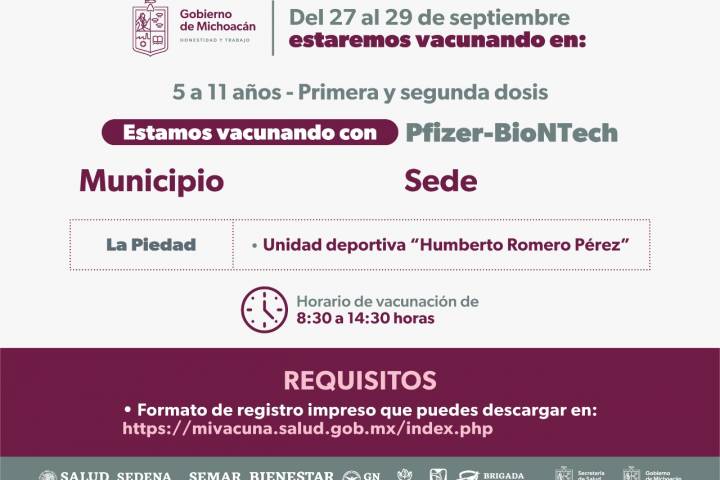 Es así que este 26 de septiembre se estarán aplicando primeras y segundas dosis de Pfizer, en un horario de 8:00 a 14:30 horas, a menores de 5 a 17 años en las Tenencias de Morelia: Capula, Jesús del Monte, Santiago U... Ver más...