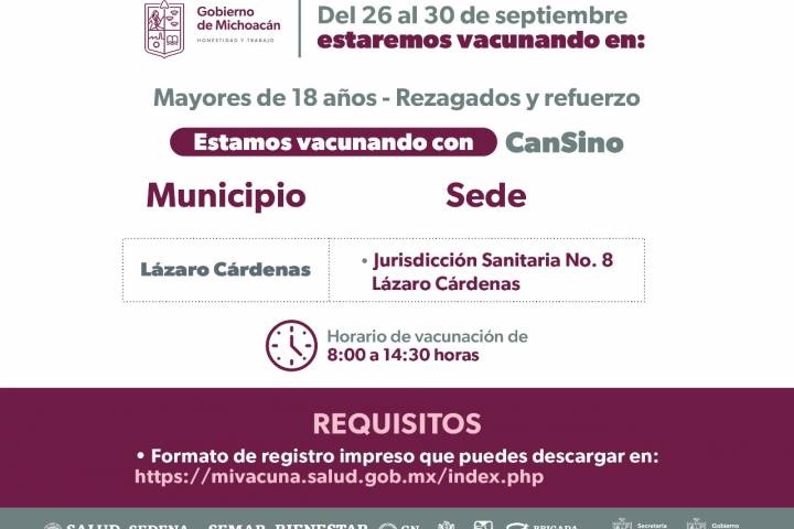 NOTICIAS 25/09/2022Habilitan 8 sedes en Lázaro Cárdenas para continuar con vacunación anti COVID-19La Secretaría de Salud de Michoacán (SSM) habilitó ocho sedes en el municipio de Lázaro Cárdenas para la inmunización de mayores de 18 años que presentan rezago o requieren refuerzo; así como primera y segunda dosis para menores de 5 a 17 años y embarazadas.