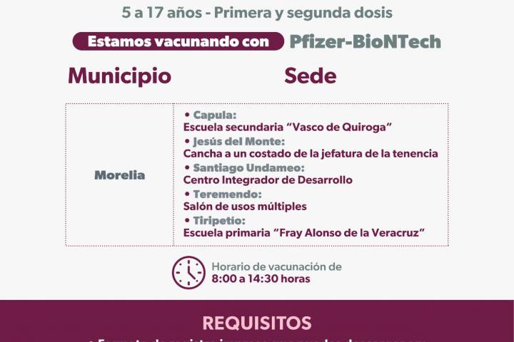 NOTICIAS 23/09/2022Próximo lunes se vacunará a niños de 5 a 17 años en 5 tenencias de Morelia Para dar cumplimiento al Plan Nacional de Salud, el próximo lunes 26 de septiembre serán vacunados, contra el COVID-19, todos los niños de 5 a 17 años de edad, en cinco tenencias de Morelia.