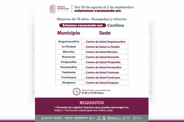 NOTICIAS 31/08/2022En septiembre, rezagados mayores de 18 años podrán vacunarse contra el Covid-19 El Gobierno del Estado, a través de la SecretarÃa de Salud de Michoacán (SSM), vacunará durante todo el mes de septiembre a los rezagados, mayores de 18 años, que aún no cuenten con ninguna dosis aplicada contra el Covid-19 o que requieran el refuerzo.