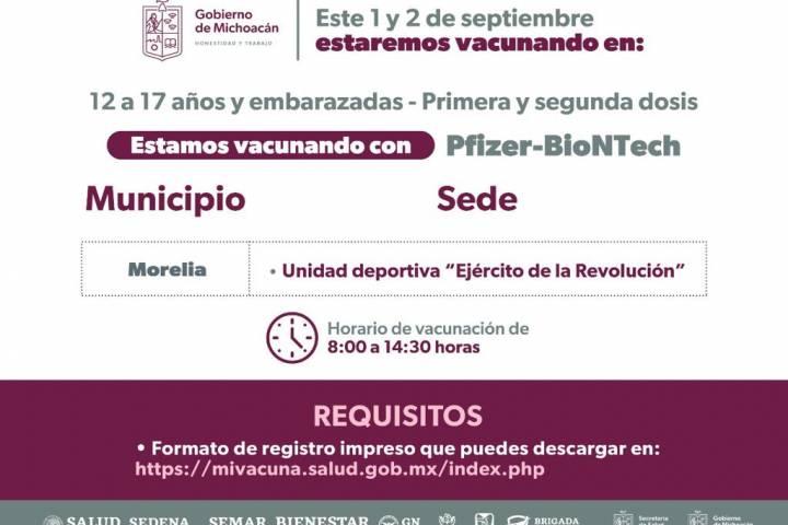 NOTICIAS 01/09/2022Del 1 al 2 de septiembre vacunarán, en Morelia, a embarazadas y adolescentes de 12 a 17 Todos los adolescentes de 12 a 17 años, asà como las embarazadas de cualquier edad, podrán vacunarse contra el Covid-19 en Morelia, este 1 y 2 de septiembre.