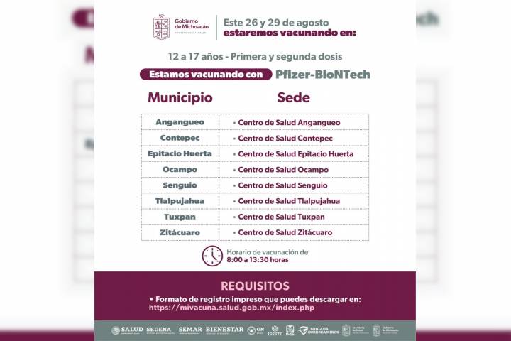 Se trata de Angangueo, Contepec, Epitacio Huerta, Zitácuaro, Contepec, Ocampo, Senguio y Tlalpujahua, cuyas sedes son en los centros de salud de cada municipio, con horario de 08:00 a 13:00 horas.