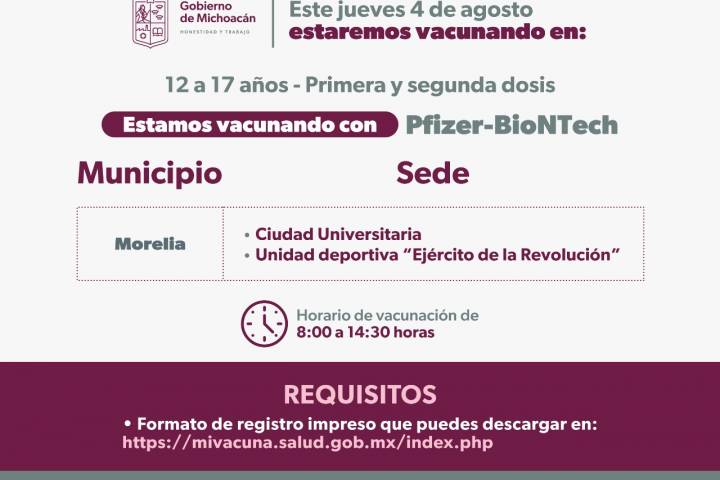NOTICIAS 05/08/2022Próximo lunes 8 de agosto vacunarán contra Covid-19 a adolescentes de 12 a 17 en tenenciasPara dar cumplimiento al Plan Nacional de Salud, este lunes 8 de agosto se estará vacunando contra el Covid-19 a todos los adolescentes de 12 a 17 años que aún no tengan su primera o segunda dosis del biólogo Pfizer-BioNTech, en cinco tenencias de Morelia.