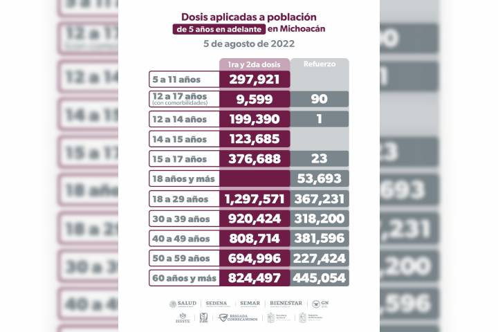 NOTICIAS 06/08/2022Más de 7 millones de dosis anti COVID-19 aplicadas en Michoacán La jornada de vacunación anti COVID-19 se mantiene de manera permanente en Michoacán; hasta el momento se han aplicado 7 millones 360 mil 379 dosis a población mayor de 5 años.