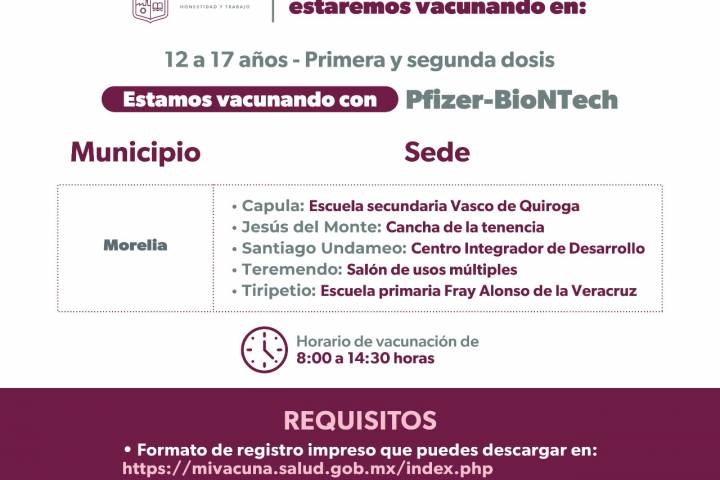 Se trata de Capula, Jesús del Monte, Santiago Undameo, Teremendo y Tiripetío los que vacunarán contra el Covid-19 a los jóvenes de 12 a 17 años cumplidos y en un horario de 08:00 ... Ver más...