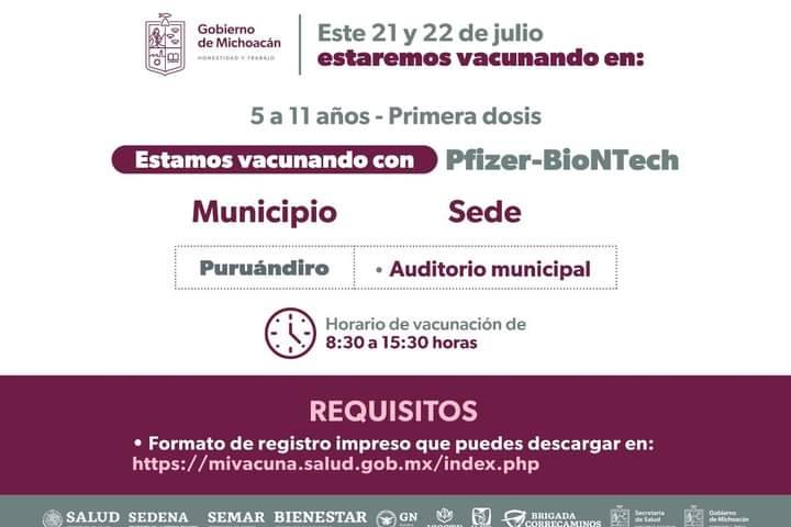 NOTICIAS 22/07/2022Continúa vacunación anti Covid-19 a niños de 5 a 11 años en el interior de MichoacánEste viernes 22 de julio, continúa la vacunación anti Covid-19 a los niños de entre 5 a 11 años de edad, en el interior de Michoacán, con módulos instalados en los municipios de Hidalgo, Huetamo, Puruándiro, Tacámbaro y Zacapu.
