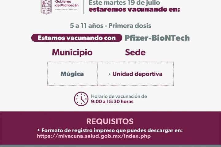 Se trata de Jacona, Pajacuarán, Zamora, Los Reyes, Peribán y Múgica, los municipios que aplicarán primeras dosis a todos los niños de 5 años cumplidos y hasta los 11 años con 11 meses, con el biológico de los laboratorios Pfizer-BioNT... Ver más...