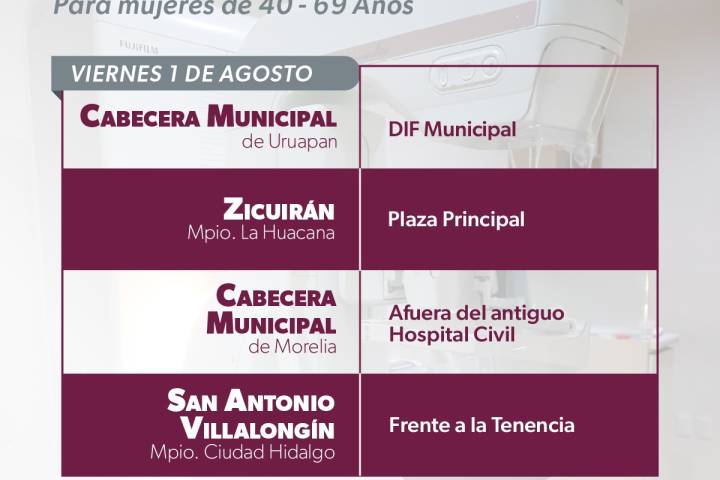 NOTICIAS 26/07/2025SSM llevará mastografías gratuitas a 8 municipios Del 28 de julio al 1 de agosto, la Secretaría de Salud de Michoacán (SSM) desplegará unidades móviles de mastografía en los municipios de Hidalgo, Charapan, Tzintzuntzan, Múgica, Huiramba, Uruapan, Morelia y La Huacana, para realizar estudios de detección temprana de cáncer de mama a mujeres de 40 a 69 años.