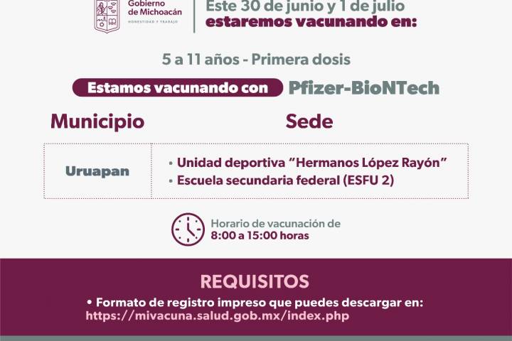 NOTICIAS 29/06/2022Avanza en Michoacán vacunación anti Covid-19 a niños de 5 a 11 años En Michoacán, avanza la vacunación anti Covid-19 a niños de 5 a 11 años de edad, y durante los dos días de jornada en Morelia, se lograron aplicar 34 mil 860 dosis del biológico Pfizer-BioNTech.