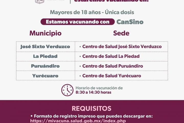 Las sedes de inmunización serán los centros de salud de los municipios de: Angangeo, Áporo, Contepec, Epitacio Huerta, Hidalgo, Huetamo, Irimbo, Juárez, Jungapeo, Ocampo, San Lucas y Senguio.