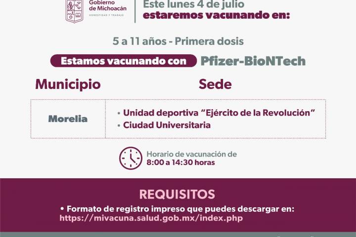 NOTICIAS 02/07/2022Tenencias de Morelia vacunarán contra el Covid-19 a niños de 5 a 11 años Para dar cumplimiento al Plan Nacional de Salud, este martes 5 de julio se estará vacunado con primeras dosis a los niños de 5 a 11 años de edad, en cinco tenencias de Morelia.