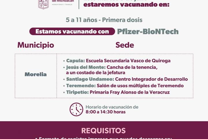 Se trata de Capula, Jesús del Monte, Santiago Undameo, Teremendo y Tiripetío los que vacunarán contra el Covid-19 a los niños y niñas de 5 años cumplidos y hasta 11 años con 11 meses, en un horario de 08:00 a 14:30 horas; el biológico que se aplicará será ... Ver más...