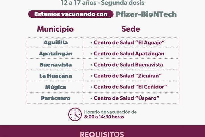 NOTICIAS 22/06/2022Aplicarán segundas dosis anti Covid-19 a menores de 12 a 17 años en región Apatzingán Del 22 al 24 de junio, la SecretarÃa de Salud de Michoacán (SSM) aplicará segundas dosis de la vacuna anti Covid-19 a menores de entre 12 a 17 años de edad en seis municipios pertenecientes a la Jurisdicción Sanitaria de Apatzingán.