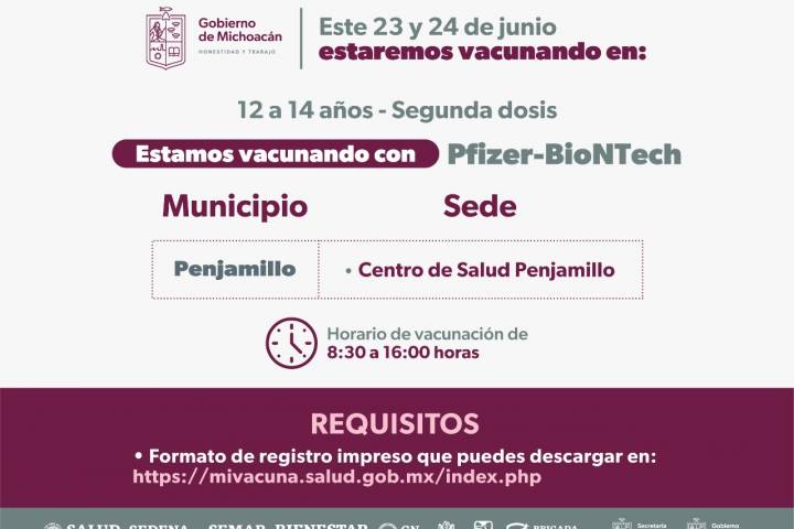 NOTICIAS 23/06/2022Aplicarán segundas dosis anti Covid-19 a adolescentes de 12 a 14 años en Penjamillo Del 23 al 24 de junio, la SecretarÃa de Salud de Michoacán (SSM) aplicará segundas dosis de vacuna anti COVID-19, a los adolescentes de 12 a 14 años, en el municipio de Penjamillo