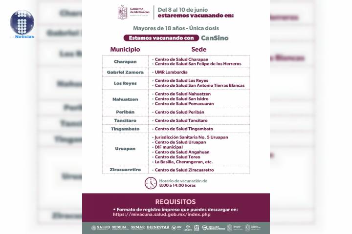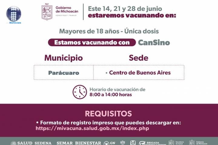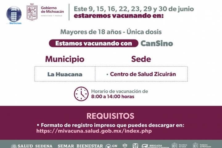 En los puestos de vacunación se estará aplicando unidosis de Cansino y los municipios que en donde se inmunizará son: Acuitzio, Ario, Coeneo, Erongarícuaro, Huiramba, Jiménez, Lagunillas, Madero, Panindícuaro y Pátzcuaro.