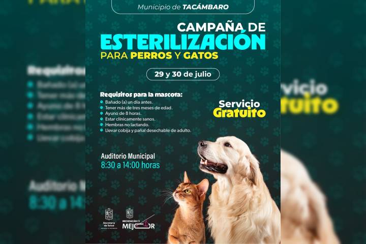 Los dÃas 15 y 16 de julio, veterinarios de la dependencia ofrecerán este procedimiento gratuito en las comunidades de Zopoco y Huáncito, del municipio de Chilchota, en los auditorios de las localidades, de 8:30 a 14:00 horas.