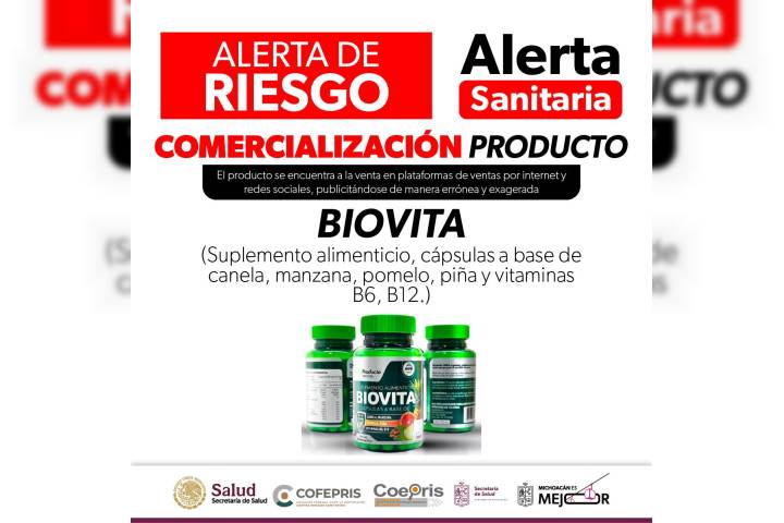 NOTICIAS 15/07/2025SSM emite alerta sanitaria sobre comercialización engañosa del producto Biovita La Comisión Federal para la Protección contra Riesgos Sanitarios (Cofepris) a través de la SecretarÃa de Salud de Michoacán (SSM), emite una alerta sanitaria a la población en general respecto a la comercialización del producto denominado "Suplemento alimenticio Biovita, cápsulas a base de canela, manzana, pomelo, piña y vitaminas B6, B12", clasificado como publicidad engañosa.