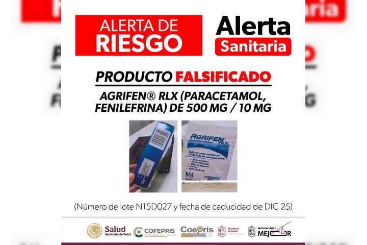 NOTICIAS 21/07/2025SSM emite alerta sanitaria por producto falsificado Agrifen® RLXLa Comisión Federal para la Protección contra Riesgos Sanitarios (Cofepris) a través de la SecretarÃa de Salud de Michoacán (SSM), informa a la población en general sobre la detección y circulación de un medicamento falsificado que representa un riesgo para la salud.