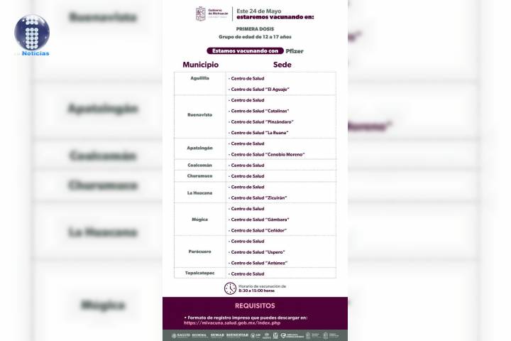 Las sedes de vacunación son los centros de salud de las cabeceras municipales de Aguililla, Buenavista, Apatzingán, La Huacana, Múgica, Parácuaro, Coalcomán, Churumuco y Tepalcatepec; pero también en los centros de las comunidades de Cenobio Moreno, La Ruan... Ver más...