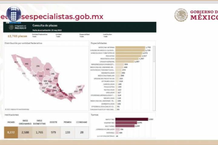 NOTICIAS 24/05/2022Anuncia gobierno federal convocatoria para Jornada Nacional de Reclutamiento y Contratación de Médicos EspecialistasEl gobierno federal publicará este martes 24 de mayo a las 12:00 horas la convocatoria de la Jornada Nacional de Reclutamiento y Contratación para Médicas y Médicos Especialistas, a través de la plataforma medicosespecialistas.gob.mx que estará disponible hasta el último minuto del viernes 3 de junio, con la finalidad de cubrir 13 mil 765 vacantes en todo el país.
