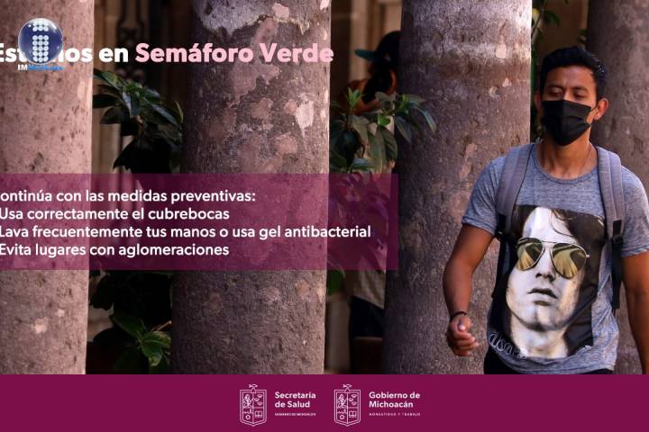 NOTICIAS 15/04/2022Michoacán permanece en semáforo verde por Covid-19La Secretaría de Salud (SSM), informa que, del 18 de abril al 1 de mayo, Michoacán permanecerá en verde del semáforo de riesgo epidemiológico por Covid-19, por lo que se exhorta a la población a seguir con acciones de prevención, utilizando el cubrebocas en espacios cerrados y en el transporte público.