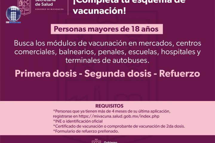 NOTICIAS 17/04/2022Anuncia SSM nueva estrategia de vacunación contra el Covid-19 para mayores de 18 añosLa Secretaría de Salud de Michoacán (SSM), informa a la población que durante todo el mes de abril, arrancará en la entidad una nueva estrategia para vacunar contra el Covid-19 a todos los mayores de 18 años y que por ello, se activarán brigadas de vacunación en: mercados, centros comerciales, balnearios, penales y escuelas del nivel medio superior.