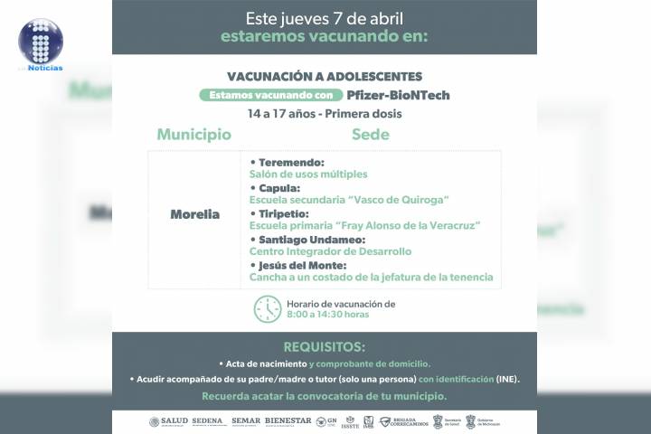 Este jueves 7 de abril, la SecretarÃa de Salud de Michoacán (SSM) aplicará primeras dosis de la vacuna anti COVID-19 a menores de 14 a 17 años, en cuatro tenencias de Morelia.