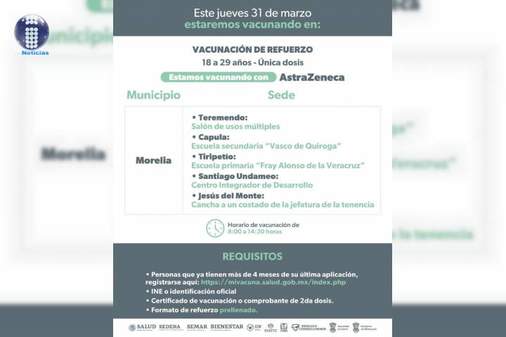 NOTICIAS 29/03/2022Jóvenes de 18 a 29 podrán aplicarse el refuerzo en las Tenencias de Morelia La Secretaría de Salud de Michoacán (SSM), invita a los jóvenes, de 18 a 29 años de edad, a que acudan a aplicarse el refuerzo anti Covid-19 este próximo 31 de marzo en las tenencias de Morelia.