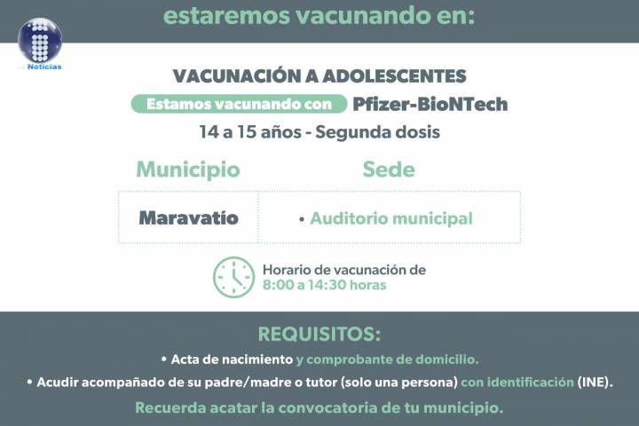 En Maravatío se atenderá a sus adolescentes de 14 a 15 años con la aplicación de segunda dosis Pfizer en el Auditorio Municipal en un horario de 8:00 a 14:30 horas; mientras que en Hidalgo en la Unidad Deportiva camino a Rincón de Dolores se atenderán rez... Ver más...