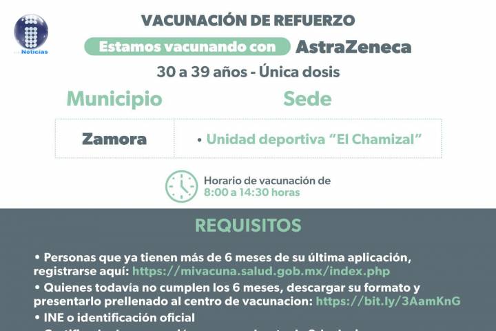 NOTICIAS 13/02/2022Arranca en Michoacán refuerzo a mayores de 30 a 39 años Este 14 de febrero, Michoacán iniciará el refuerzo de vacunación anti COVID-19 a población de 30 a 39 años de edad, sólo para personas que cuenten con su esquema completo (Sinovac, AstraZeneca, Pfizer y Cansino).