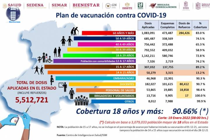 NOTICIAS 24/01/2022Michoacán rebasa los 6 millones de vacunas contra COVID-19 aplicadasMichoacán sobre pasa los 6 millones de dosis aplicadas anti COVID-19, para personas de 12 años y más lo que representa una cobertura poblacional del 90 por ciento.
