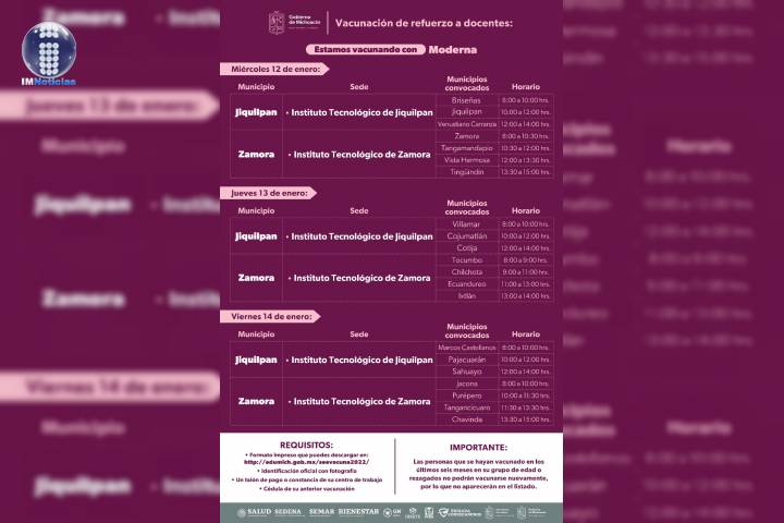 NOTICIAS 11/01/2022Del 12 al 15 de enero arranca en Michoacán, el refuerzo de inmunización anti COVID-19 para el sector educativoDel 12 al 15 de enero arrancará el refuerzo de inmunización anti COVID-19 en 32 municipios de la entidad, para las y los más de 100 mil docentes michoacanos.
